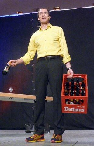 Ein wahres Komödien-Feuerwerk feuerte der Olympiasieger dann im letzten Teil seines Auftritts auf, als er demonstrierte was dem Läufer inzwischen alles an Accessoires angeboten wird. Dabei bestach Baumann auch mit einer hervorragenden Situationskomik, von der sich mancher gestandene Komiker eine große Scheibe abschneiden könnte. Auch Bürgermeister Heiko Faber, passionierter Fußballer und Nichtläufer, bekam einiges von Dieter Baumann zu hören. Die Besucher feierten Dieter Baumann am Ende der Vorstellung mit begeistertem Beifall. Baumann selbst verabschiedete sich mit den Worten: „Auf Wiedersehen in Kieselbronn.“