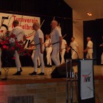 Völlig abrupt, aber geplant und wohl durchdacht, erklang kurz danach Marschmusik aus den 90er Jahren des 20. Jahrhunderts und in der Uniform der frühen Turnzeit, eben aus der Gründerzeit des Turnvereins, marschierten 20 Männer auf die Bühne um eine Stabgymnastik zu zeigen, die ihnen ihre Trainer Wolfgang Wünsch und Hans Zechmeister beigebracht hatten.